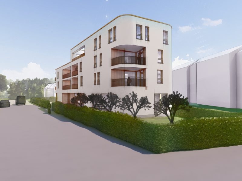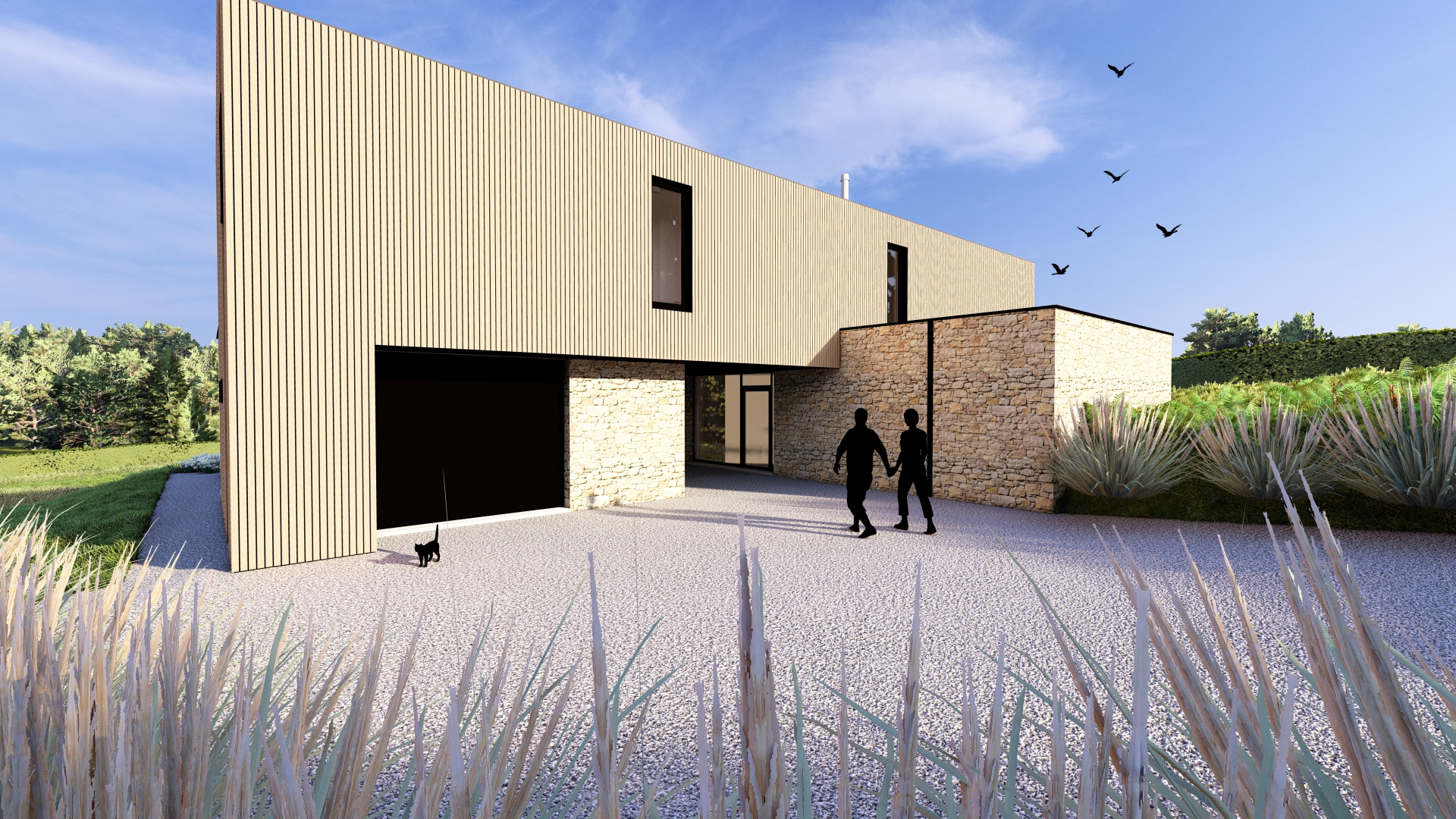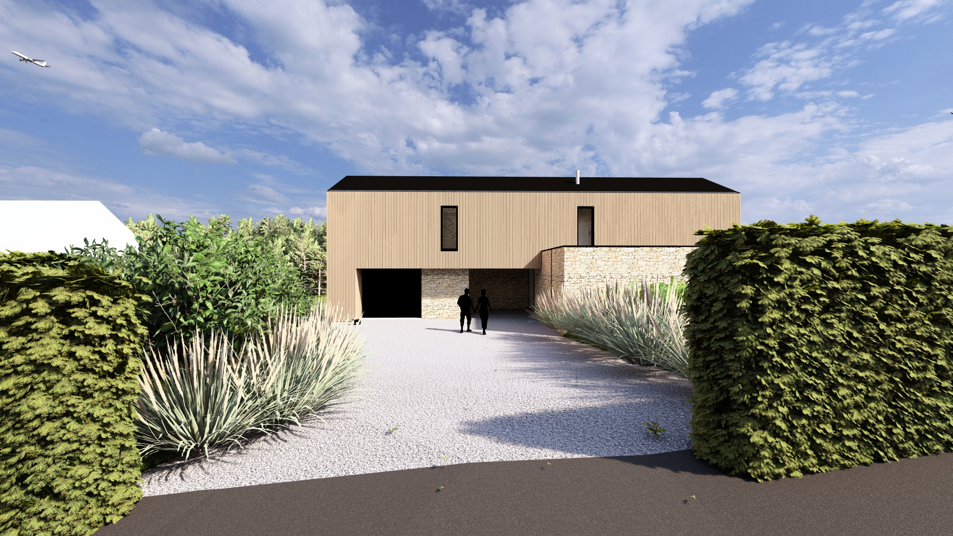Le volume principal avec sa toiture à versants s’aligne en façade avant sur le futur voisin.