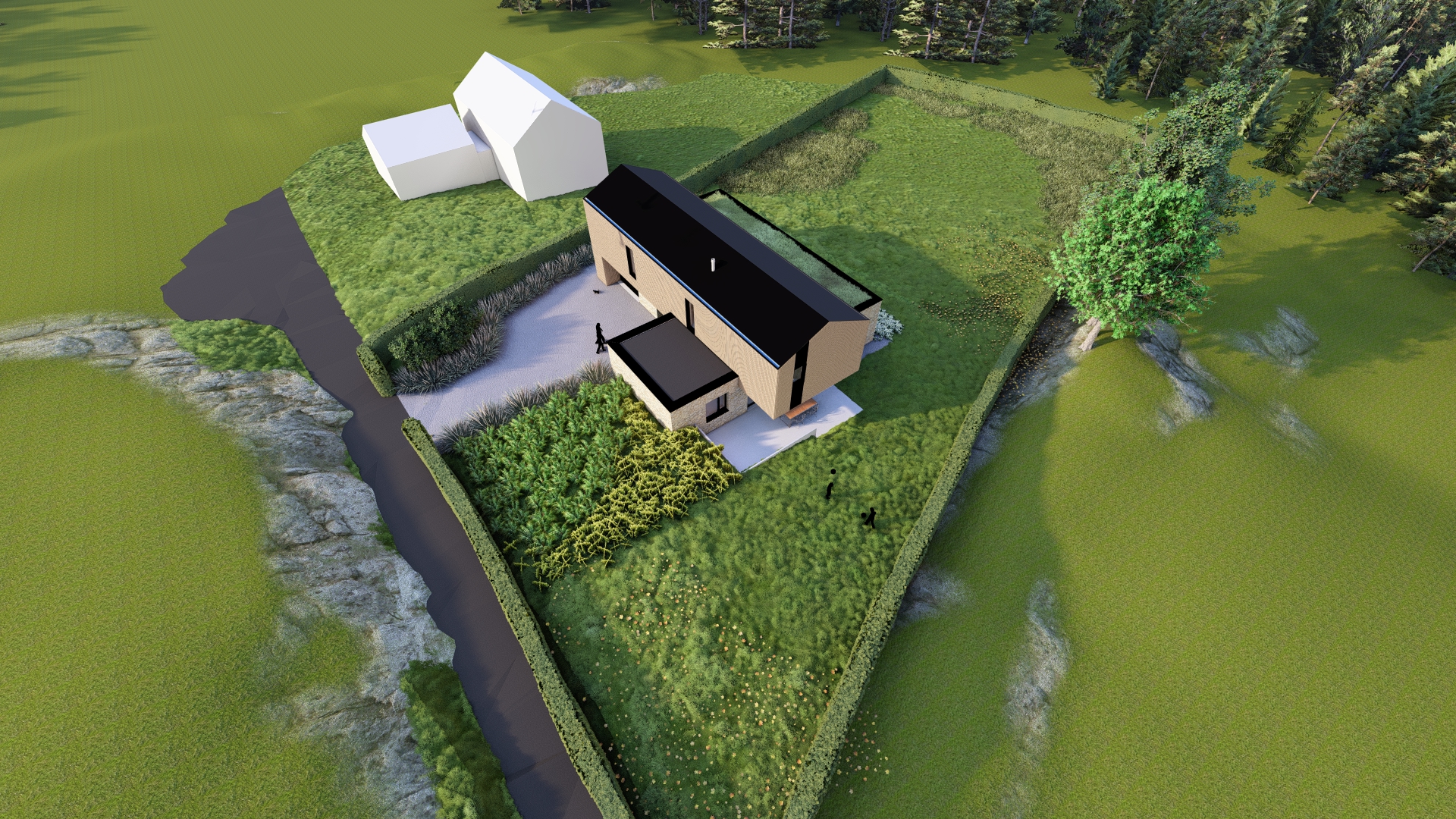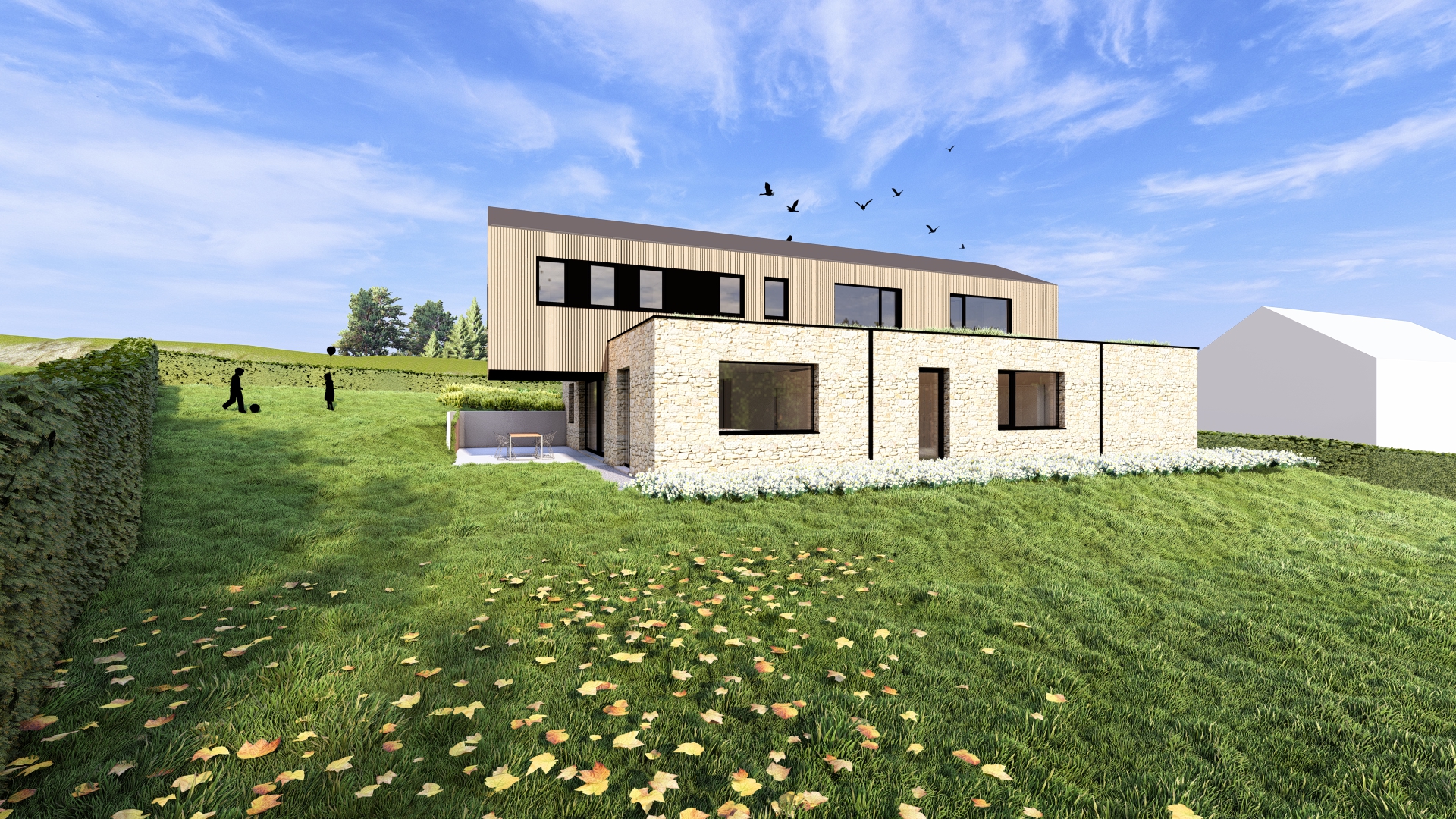 Par des jeux de creux et de volume, des fonctions extérieures sont générées. La façade avant est évidée afin de créer un car-port et une séquence d’entrée couverte parfaitement intégrés dans le volume principal. En façade latérale droite, le volume de l’étage ressort du socle afin d’abriter une terrasse. L’implantation de cette terrasse côté SUD permet de jouir à la fois de la vue vers la vallée de la Hoëgne et également de profiter tout au long de la journée de la course du soleil. Ce volume en débord protège le séjour de la surchauffe en été lorsque que celui-ci balaye la façade SUD au plus haut. Cette casquette laisse pénétrer les rayons du soleil dans l’habitation en hiver lorsque le soleil fait sa course la plus basse.