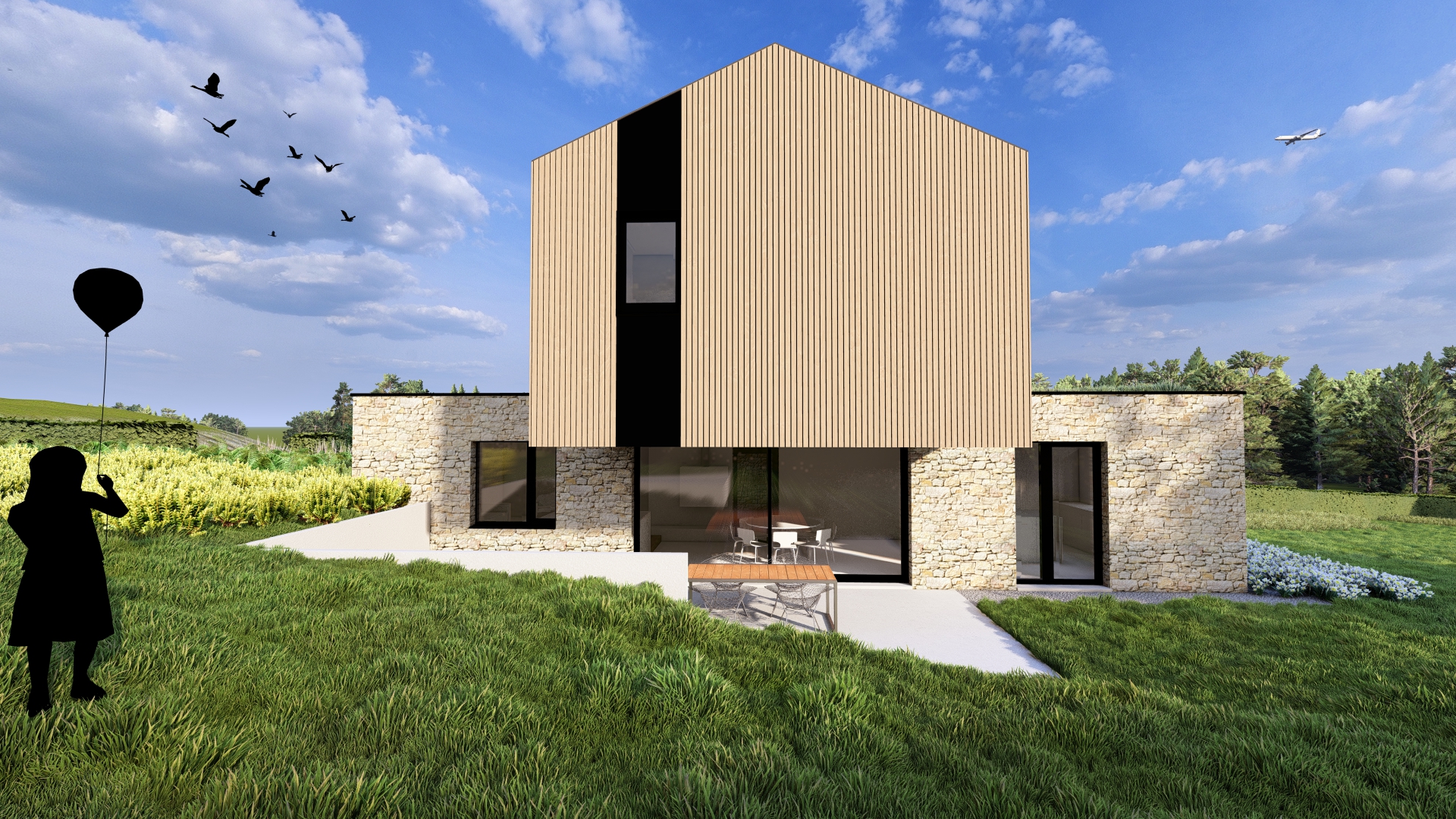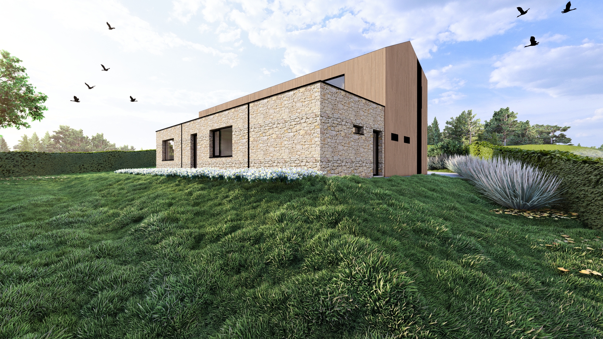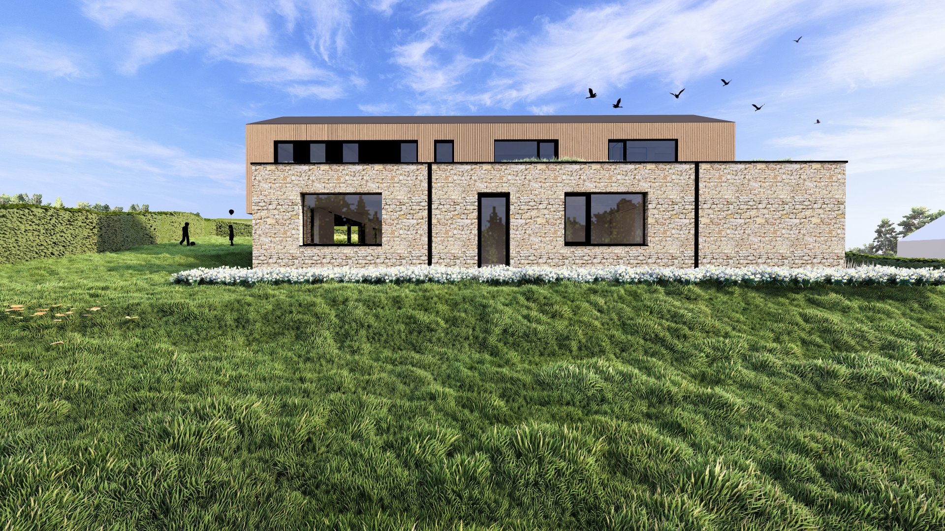 Deux matériaux d’élévations sont utilisés. Le socle structurel et visuel est constitué de moellons de grès et sert de support à la partie bardées de bois ajouré pré-traité grisé.